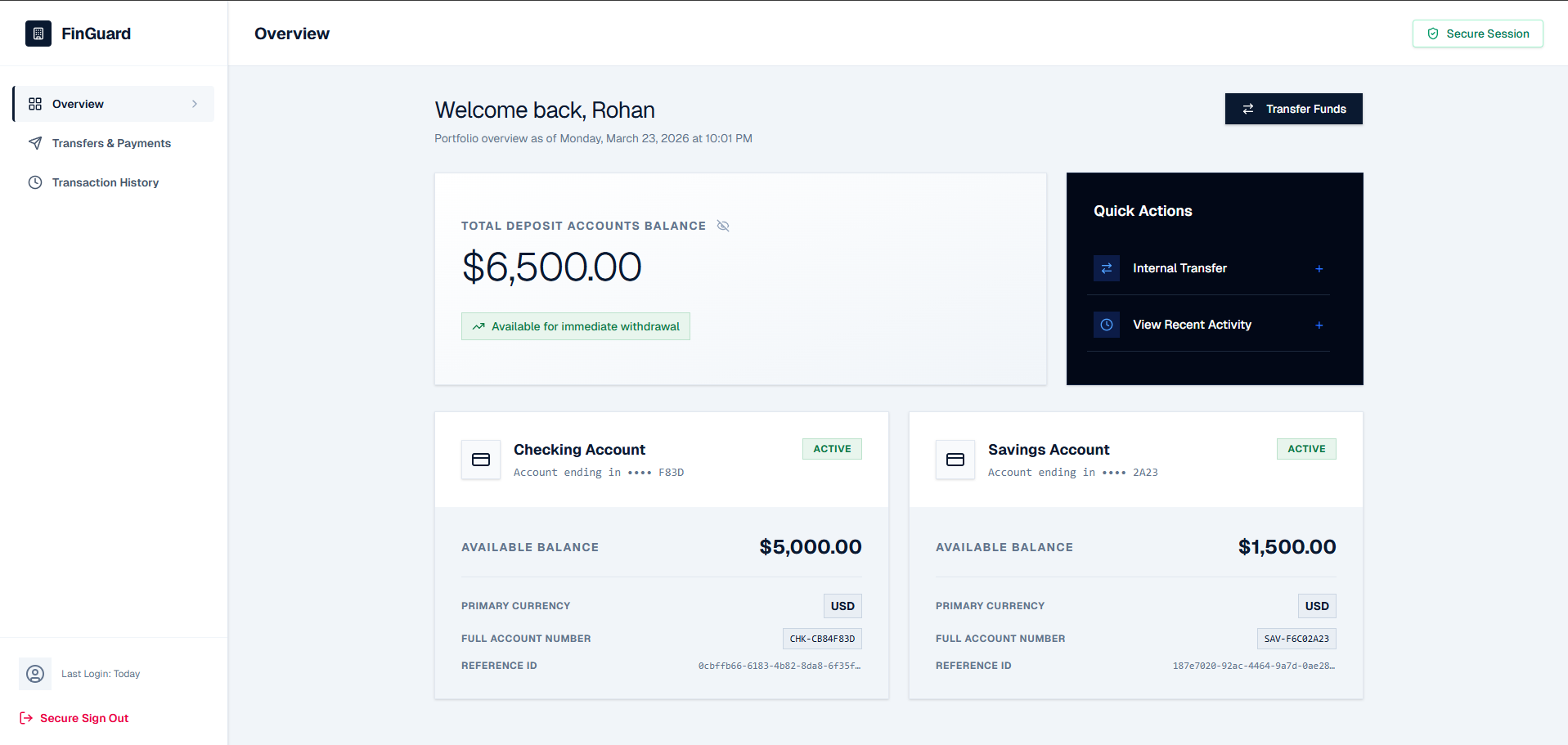 Finguard is an enterprise-grade banking platform designed to manage secure, complex financial operations. The application features a robust, containerized backend built with Java 21 and Spring Boot, protected by an Nginx reverse proxy with SSL/TLS encryption. It ensures strict data integrity through ACID-compliant PostgreSQL transactions and optimistic locking, while providing secure user access via JWT authentication. The seamless frontend is powered by React, with automated CI/CD workflows handled by GitHub Actions to guarantee reliable deployments.